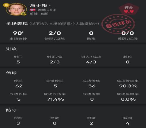 本場比賽,海於格完成梅開二度,是閃耀哥能在主場拿分的最大功臣,賽後他的評分也高達9.9分。
