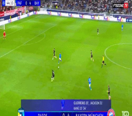 拜仁實力優勢明顯,從開局就壓著對手猛攻。第7分鍾,迪亞斯左路突破,內切之後起腳勁射,帕福斯門將飛身將球撲出。緊接著的角球攻勢,奧利塞送出傳中,凱恩高難度倒鉤攻門,可惜擊中橫梁彈出。