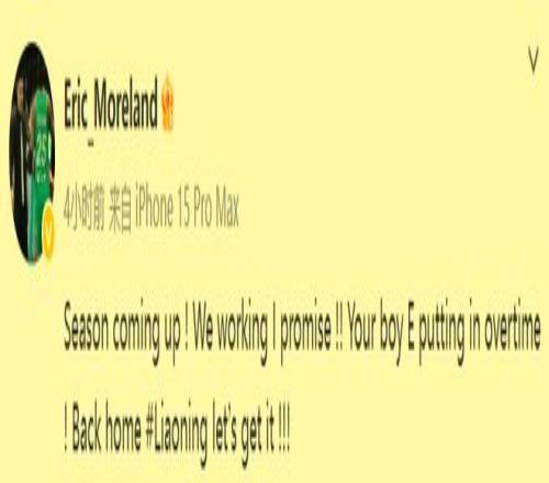 莫蘭德還承諾,自己會更加努力地投入到訓練中,很想和遼籃的兄弟們一道,再次向CBA總冠軍發起衝擊。