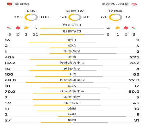 控球率方麵,阿森納達61%,反觀奧林匹亞科斯則為39%。傳球數據方麵,阿森納全場484次傳球,傳球成功率達到82.2%;奧林匹亞科斯全場295次傳球,傳球成功率72.2%。