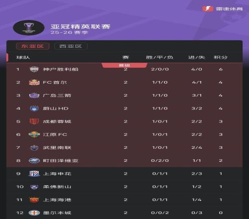 亞精英賽兩輪過後,成都蓉城1勝1負積3分排名第5 ,上海海港1平1負積1分排名第11,上海申花同樣1平1負積1分暫列第9。