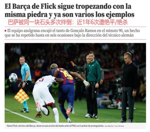 歐冠聯賽階段第2輪,巴薩主場1-2負於巴黎聖日耳曼,遭遇賽季首敗。10月2日,《世界體育報》指出,巴薩在第90分鍾丟球遭絕殺,這讓主帥弗裏克很不滿。最近1年,巴薩已經6次被絕平或者絕殺。