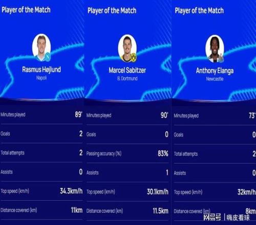 先看看全場最佳,根據歐足聯官網發布的信息,來自那不勒斯的霍伊倫,多特蒙德的薩比策,還有紐卡斯爾的埃蘭加,三名曼聯舊將,賽後都被評選為全場最佳。同時,三支球隊均迎來歐冠的首場勝利,首輪補時連丟兩球,失去2分的多特蒙德,已經上升到積分榜的前八名。