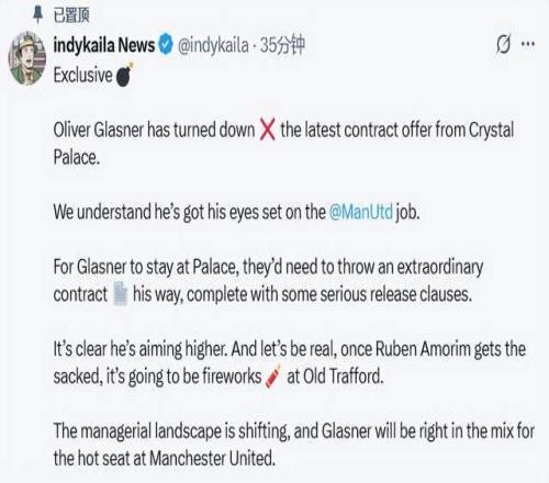 2025-26賽季英超,水晶宮是唯一保持不敗的球隊,6戰3勝3平積12分,排在第3位。水晶宮主帥格拉斯納,展現出優秀的執教能力。10月2日,著名資訊賬號indy kaila(球迷稱呼為綠帽哥)獨家爆料,格拉斯納拒絕水晶宮的續約合同,他在等待曼聯的召喚。