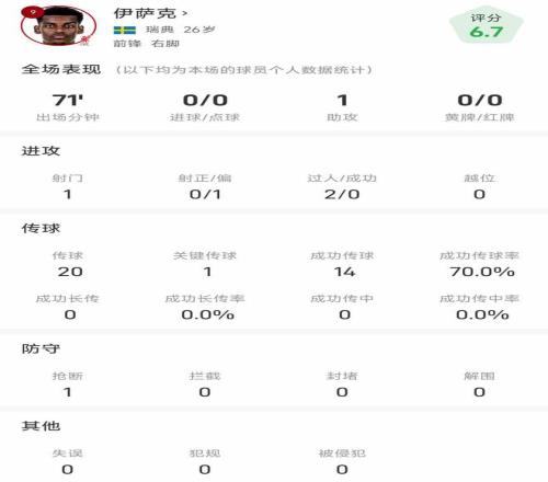 伊薩克本場比賽20次傳球,其中14次成功,成功率70%,包括1次關鍵傳球。