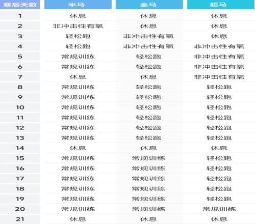 如果你尚未找到符合自己的恢複時間表,並且希望在完成半程馬拉鬆、馬拉鬆或超級馬拉鬆後盡快準備好以重返訓練,你可以參考這個時間表。
