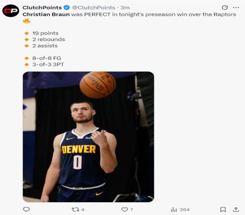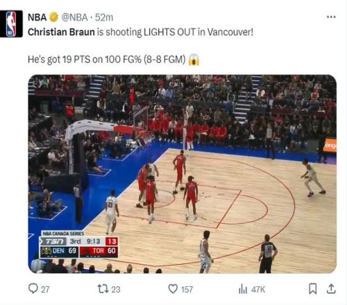 第二節1中1,第三節2中2+三分1中1,全場比賽22分鍾,8中8+三分3中3拿到19分2籃板2助攻2搶斷,NBA官方曬出布勞恩8中8的集錦發了一個驚呼的表情。