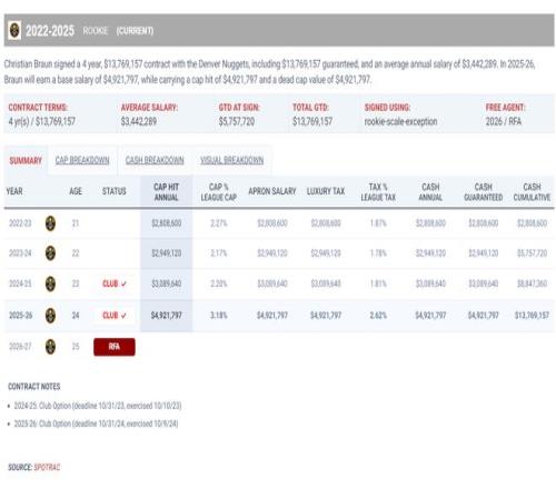 他25-26賽季已經是新秀合同的最後一年,他在10月20日前可以與掘金達成提前續約(頂薪是五年2.47億含激勵條款),如果今夏他無法與掘金達成續約明夏將成為受限製的自由球員,屆時很多球隊就可以報價,如果他真的能繼續成長,那麽24歲的布勞恩有希望拿到2億的超高合同。
