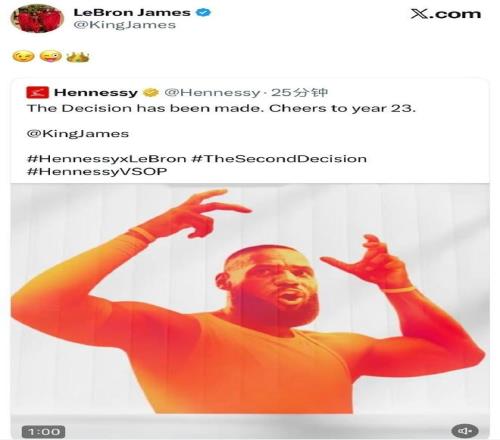 原本詹姆斯公布的時間是10月8日0點公布,但如今詹姆斯提前一個小時公布了“決定二”。果然不出所料不是退役決定,他通過社媒視頻宣布“決定將自己的天賦帶給著名白蘭地品牌軒尼詩。”詹姆斯轉發了軒尼詩官宣合作的消息,並配上了幾個表情包。