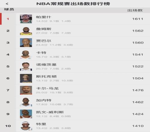 截至目前,詹姆斯已經打了1562場常規賽,距離羅伯特-帕裏什的曆史紀錄(1611場)僅差49場。常規賽總出場時間、總得分、總出手、總失誤和打鐵數,均是曆史第一。運動戰進球數和罰球命中數,均是常規賽曆史第二。