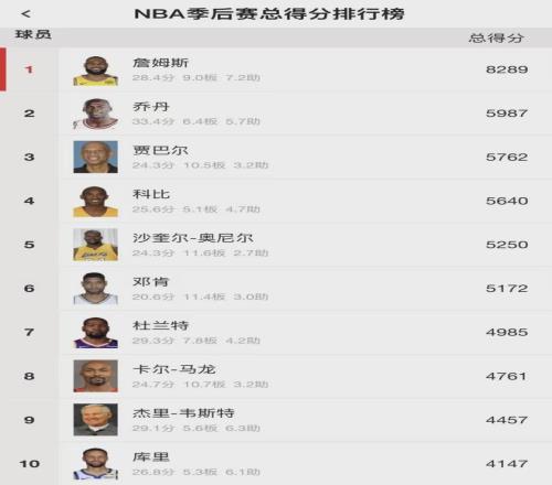 詹姆斯季後賽出場數、出場時間、總得分、總搶斷、總出手、總進球、總打鐵、總罰球、總失誤等多項數據,均是曆史第一。季後賽三雙次數和總助攻數均是曆史第二,兩雙次數和三分命中數均是曆史第三,總籃板曆史第四。