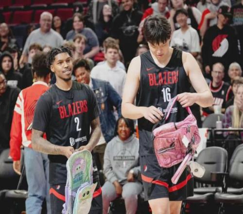 而這一個球迷日,開拓者所呈現的不止是比賽,還有表演,他們上演了NBA常見的“新人歡迎”內容:讓新秀球員背上了兒童書包。