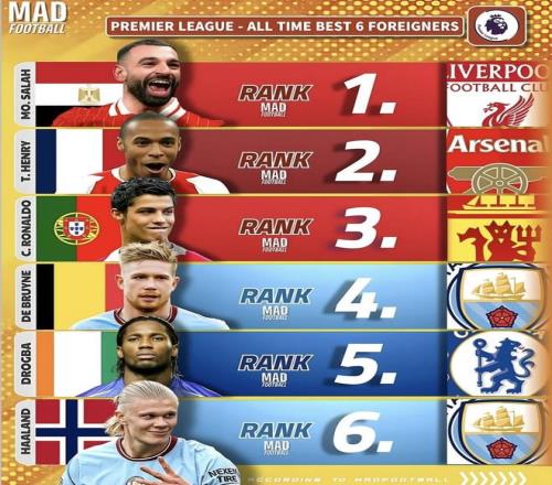 近日,MAD FOOTBALL 盤點了“英格蘭超級聯賽曆史最佳外援6人”。這份排名引發了不少討論:英超這邊,薩拉赫力壓亨利、C羅登頂。為了方便大家直觀對比,我把每位球員在聯賽的經曆梳理為四項:效力過的俱樂部、隨隊榮譽、個人榮譽,以及效力年齡範圍。(數據截至北京時間2025年9月20日)