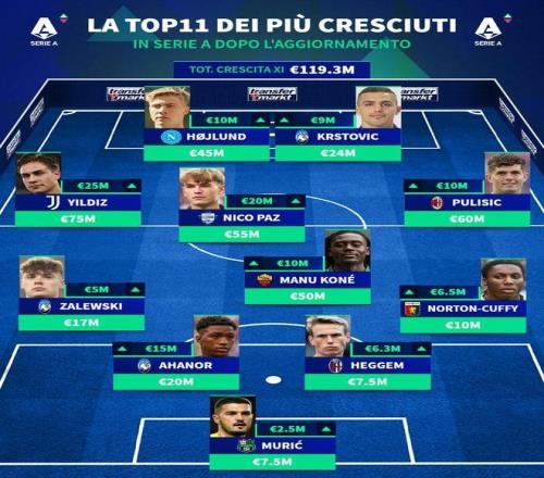 德轉更新後意甲身價漲幅最佳11人陣容: