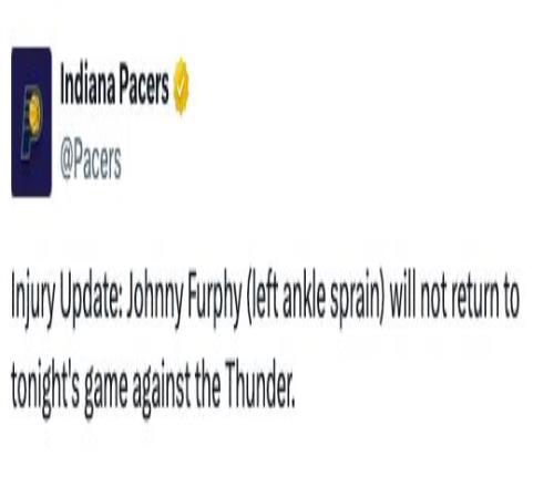 本場比賽步行者接連遭遇打擊,先是宣布昆頓·傑克遜因為右腿筋疼痛提前退出比賽,接著又宣布約翰尼·弗菲因為左腳踝扭傷退出比賽。