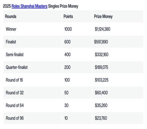 2025勞力士大師賽獎金。來源:ATP TOUR 官網