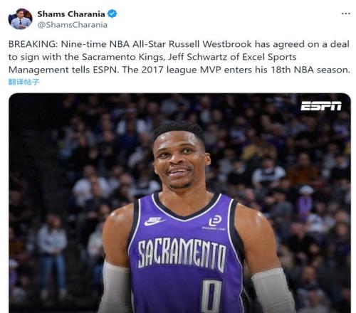 據名記Shams報道,威少已經同意加盟國王,據Shams補充報道,威少和小薩、德羅讚、拉文的關係很好,和國王的總經理、主教練也有著良好關係,所以國王對於引入威少是很積極的。