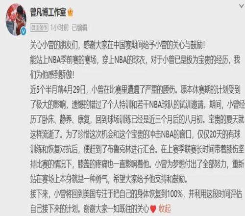 曾凡博工作室對此發表聲明稱,曾凡博將回到美國專注於把自己的身體恢複至100%。並評估下一步的計劃。