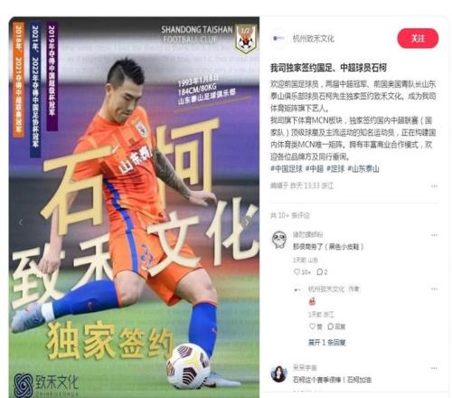 最近一段時間,有網友發現,山東泰山後衛石柯的抖音賬號動態更新變得頻繁起來。10月15日,“杭州致禾文化”小紅書賬號曬照並宣布——“前國足球員石柯獨家簽約致禾文化,成為我司體育矩陣旗下藝人。”