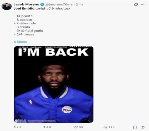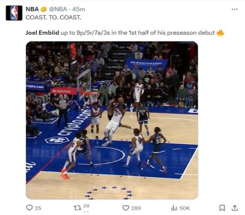 賽前ESPN記者蕾夢娜-謝爾伯恩就表示:恩比德的康複實際上超過了預期,他可以在新賽季開始前重返賽場對於費城來說是一個巨大的利好。