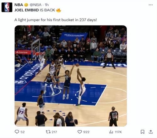 NBA官方全程記錄著大帝的複出,開場第二攻就是大帝持球的撤步中距離,那個技術細膩的常規賽MVP還在,恩比德還是那麽的厲害,NBA官方寫道:時隔237天的第一次跳投得分。