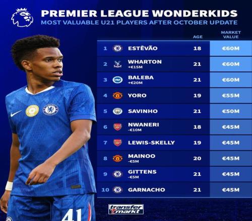 在更新了英超球員身價後,德國轉會市場網站列出了U21球員身價榜,埃斯特旺、沃頓和巴萊巴以6000萬歐居首。