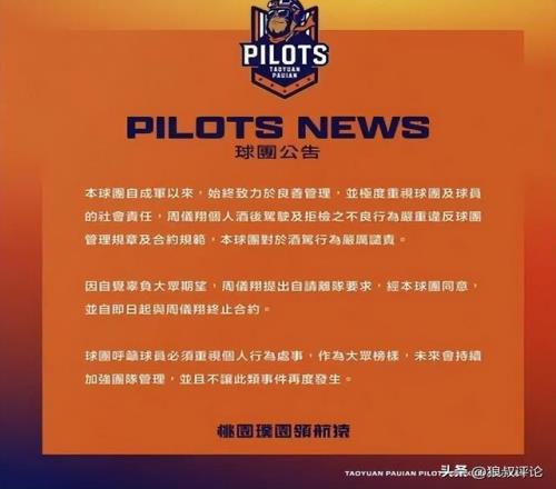 去年,周儀翔因酒駕拒檢引發外界的熱議,P聯賽桃園領航猿隊官方宣布,球員周儀翔酒後駕駛並抗拒檢查,違反了球隊的相關條例規定,自今日起正式終止與其合約。