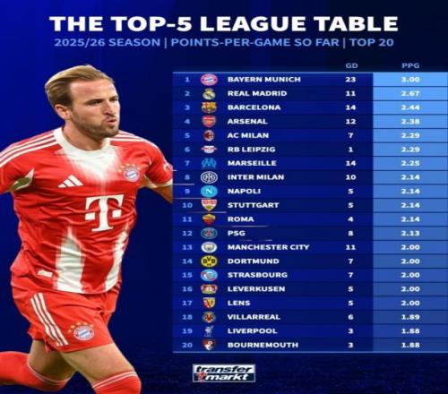 《轉會市場》統計了本賽季五大聯賽球隊的場均拿分情況,拜仁、皇馬、巴薩、阿森納分列前四。本賽季五大聯賽場均拿分榜(及淨勝球數):