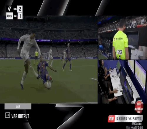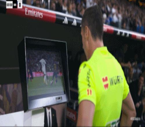 下半場剛開始,貝林厄姆突入禁區,與巴薩後衛埃裏克·加西亞發生接觸後倒地。主裁判未予理會,判給皇馬角球。VAR再次介入,提示防守球員存在手球犯規。主裁經視頻回看後,果斷改判點球。
