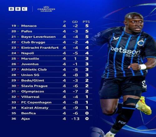 目前4輪戰罷,仍有2隊至今1分未得。還是兩支前賽會冠軍,穆帥執教的本菲卡主場0-1不敵勒沃庫森,阿賈克斯則是0-3潰敗給加拉塔薩雷,4輪0分後,兩隊晉級附加賽的希望相當渺茫。