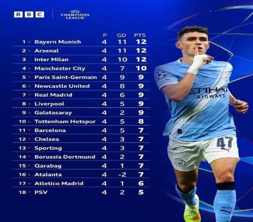 目前排名積分榜第5至第8位的分別是大巴黎、紐卡、皇馬和利物浦。他們與拜仁、阿森納、國米和曼城一起,在歐冠賽程過半情況下,這8支球隊處於淘汰賽直通區。