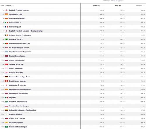 值得注意的是,英格蘭第2級別聯賽“英冠”聯賽竟然位居第6位,力壓比甲、巴甲、葡超等其他傳統足球強國的一級聯賽。而梅西所效力的美職聯,則排名第10位。
