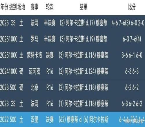 阿爾卡拉斯當然有理由興奮,畢竟他和穆塞蒂兩人職業生涯至今交鋒七次,六勝一負遙遙領先。2022年ATP250烏瑪格站決賽,阿爾卡拉斯三盤不敵穆塞蒂,輸掉了兩人職業生涯首次交鋒。此後六次交鋒,包括四次紅土、兩次硬地交鋒,阿爾卡拉斯全部戰勝對手,其中今年就是三次紅土交鋒。