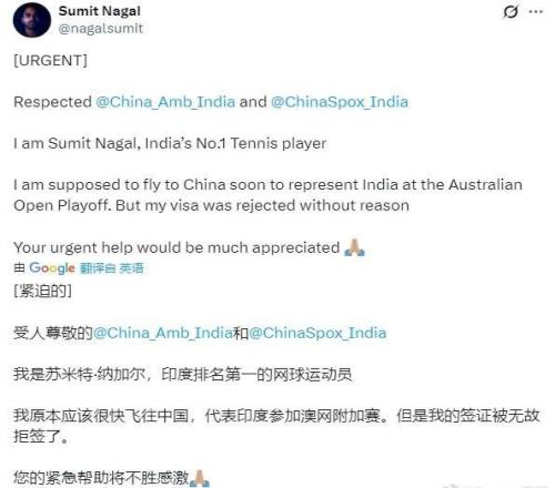 近日,據外媒報道,印度網球選手前往中國參賽遭拒簽,社媒求助中國駐印度大使館。