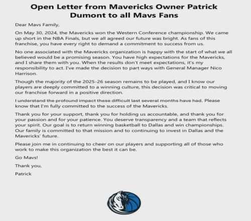 邁克爾-芬利和馬特-裏卡迪,成為獨行俠臨時總經理。截至教主發稿,獨行俠3勝8負排名西部倒數第二,戰績僅好於2勝8負的鵜鶘。獨行俠老板杜蒙特發表公開信:全隊上下都無法接受這個糟糕的開局,我必須采取行動,解雇哈裏森!