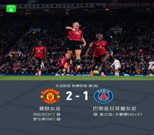 北京時間11月13日女足歐冠 聯賽階段 第3輪,曼聯女足對陣巴黎聖日耳曼女足。曼聯女足馬拉爾破門,羅爾弗破門。巴黎聖日耳曼女足奧爾加-卡蒙娜破門。最終比分曼聯女足 2-1 巴黎聖日耳曼女足。曼聯女足取得女足歐冠的三連勝,同時送給巴黎女足3連敗。