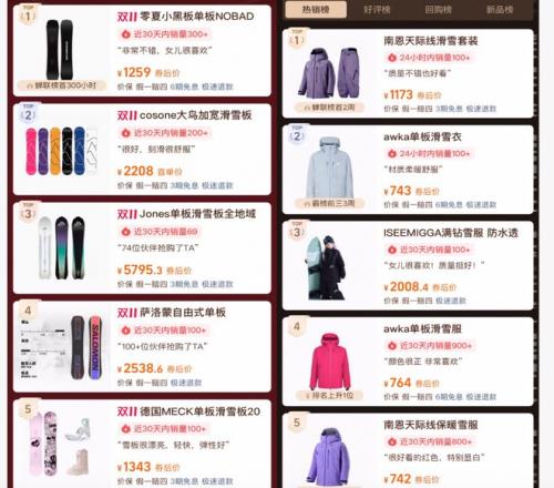 在今年某購物平台“雙十一”的滑雪裝備熱銷榜中,滑雪板與滑雪服位列最受歡迎的前十名,成為大眾消費的熱點。目前,滑雪板的普遍價格在2000元左右,而滑雪服則多在500至1000元區間。