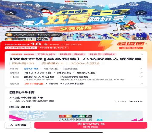 以滑雪熱門地河北張家口為例,近幾年當地滑雪場數量大幅擴容,競爭愈發激烈,多家雪場紛紛下調價格,百元內就能拿下門票,和此前兩三百元的定價形成鮮明對比。一些其他雪場甚至在團購平台上推出19.9 元、29.9元的超低價雪票,堪稱“白菜價”體驗。