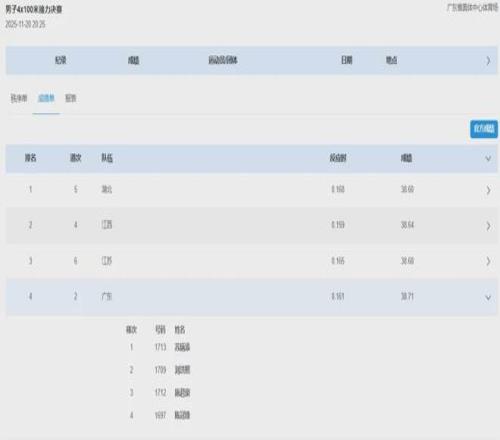 今晚(11月20日),十五運會進行了田徑項目男子4×100米接力決賽。由蘇炳添、劉洪熙、施君豪、陳冠鋒組成的廣東隊以38秒71,最終名列第四,遺憾未能站上領獎台。