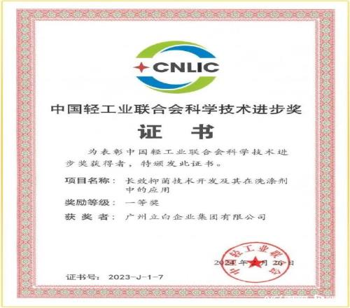 立白衛仕長效抑菌技術榮獲“中國輕工業科技進步獎一等獎”。