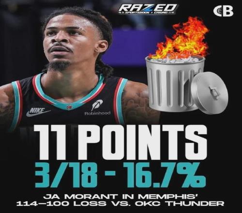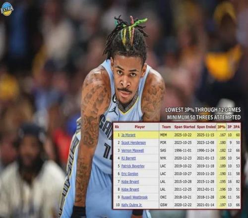 據統計,迄今為止莫蘭特三分球60中10,命中率低至可憐的16.7%,在NBA史上所有賽季前12場三分出手數至少50次的球員裏麵命中率最低。
