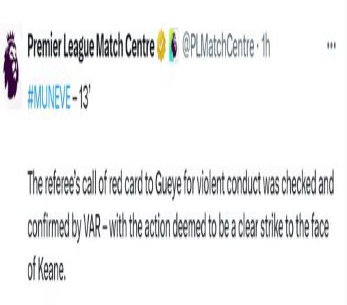 北京時間11月25日04:00,英超聯賽第12輪,曼聯坐鎮主場迎戰埃弗頓。上半場13分鍾,蓋耶與隊友基恩發生衝突領紅下場。(後續英超官方給出解釋:“主裁判認定蓋耶實施暴力行為並出示紅牌的判罰,經VAR技術核查確認,該動作被判定為對基恩麵部的明顯擊打動作。”)