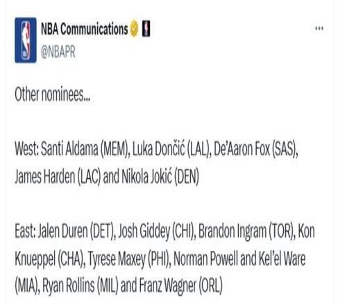 西部:阿爾達馬(灰熊)、東契奇(湖人)、福克斯(馬刺)、哈登(快船)、約基奇(掘金)