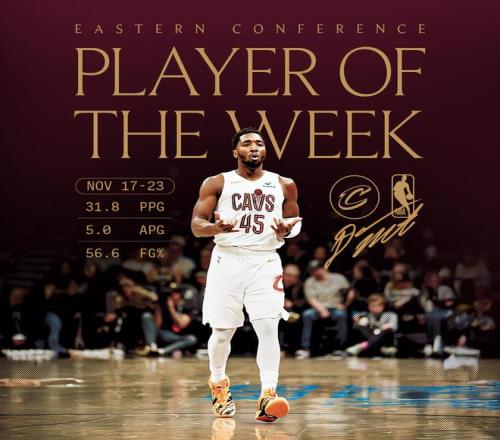 過去一周,米切爾率隊取得3勝1負的戰績,他場均貢獻31.8分6.3籃板5助攻,投籃命中率56.6%。