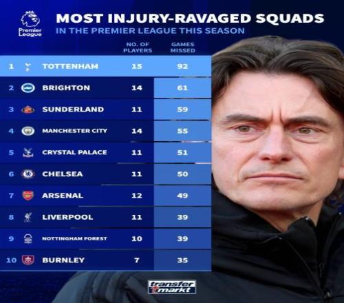 北京時間11月25日,德轉統計出了本賽季傷病最多的10支英超球隊,托特納姆熱刺以15名球員受傷,合計缺陣92場比賽排名第一,曼城在榜單上位列第四,切爾西第六,阿森納第七,利物浦第八。
