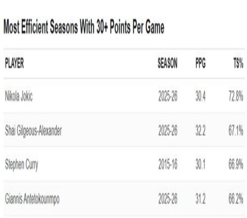 但閃耀的並非隻有約基奇。這位掘金內線核心正朝著打破自己保持的單賽季球員效率值(PER)紀錄邁進,而另外兩位MVP得主——雄鹿隊的字母哥和雷霆隊的亞曆山大也正在刷新這一紀錄。據Stathead數據顯示,截至北京時間本周二,在NBA曆史上所有單賽季場均至少30分的96名球員中,約基奇、亞曆山大和字母哥的真實命中率分別位列第一、第二和第四。排在第三的是勇士隊球星庫裏在2015-16賽季的表現——那個賽季他成為了聯盟曆史上唯一一位全票MVP。