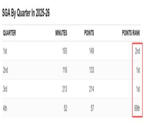 盡管雷霆隊本賽季賽程相對輕鬆,多場比賽早早拉開分差,亞曆山大極少出戰第四節,但他的得分依然源源不斷:他的第一節得分位列聯盟第二,第二節和第三節得分均高居聯盟第一——而第四節得分僅排名第69位。