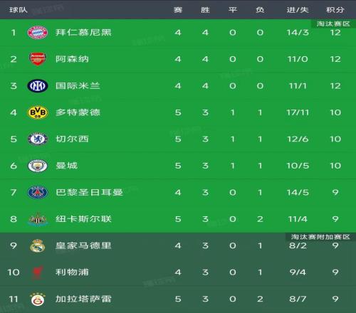 北京時間11月26日,歐冠第5輪率先結束了9場比賽,最新積分榜如下!