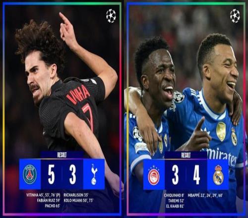 另一邊,上賽季歐冠冠軍巴黎迎戰熱刺。維蒂尼亞上演帽子戲法,法比安、帕喬和穆阿尼進球,裏沙利鬆首開紀錄和穆阿尼梅開二度,最終巴黎主場5-3取勝積12分排在第2,熱刺積8分位列第16。