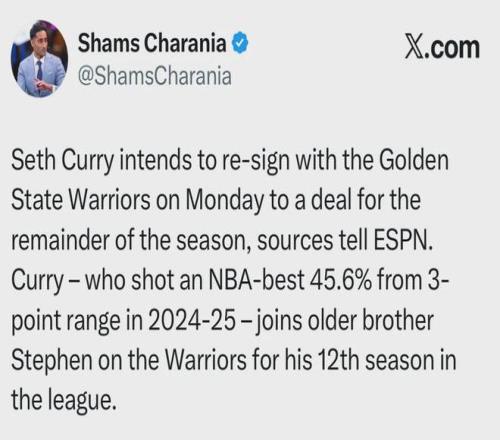 爆料王Shams報道:賽斯-庫裏,將與勇士簽約至本賽季結束。
